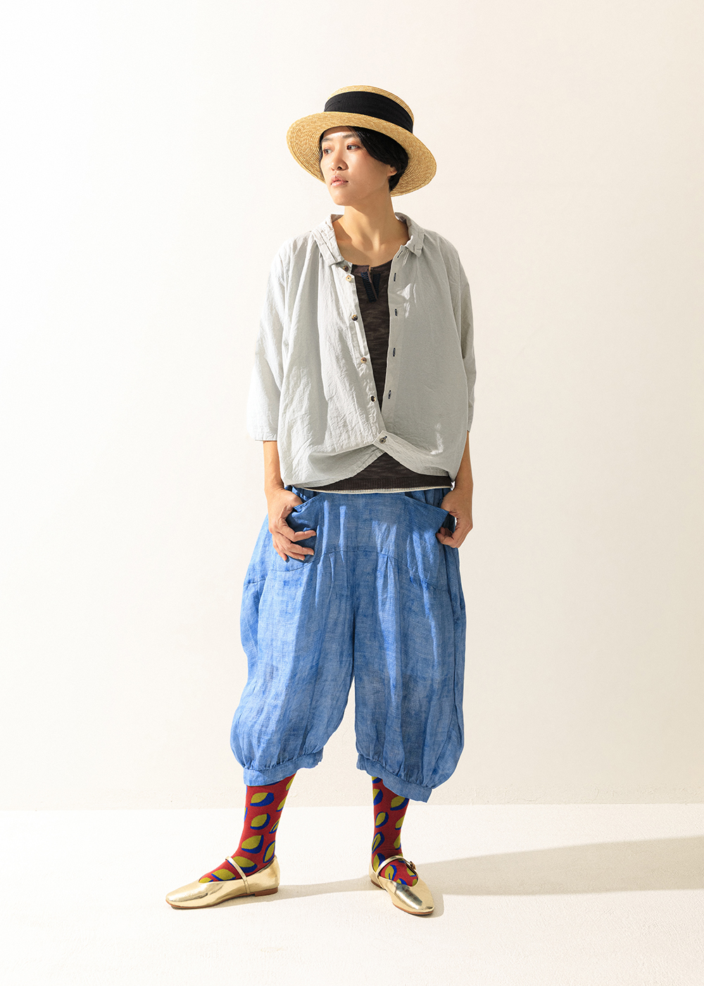 |苧麻微涼|亨利領珠節織帶寬版上衣