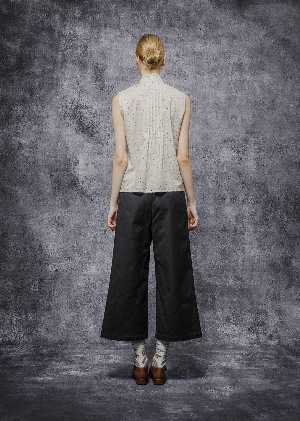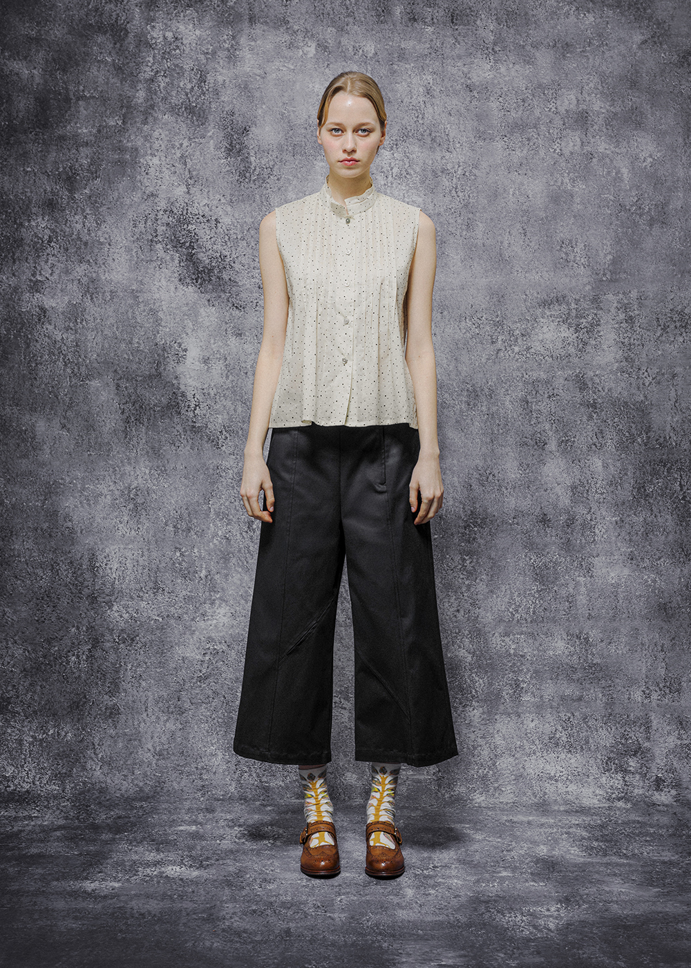 不對稱飾片開衩微寬八分長褲