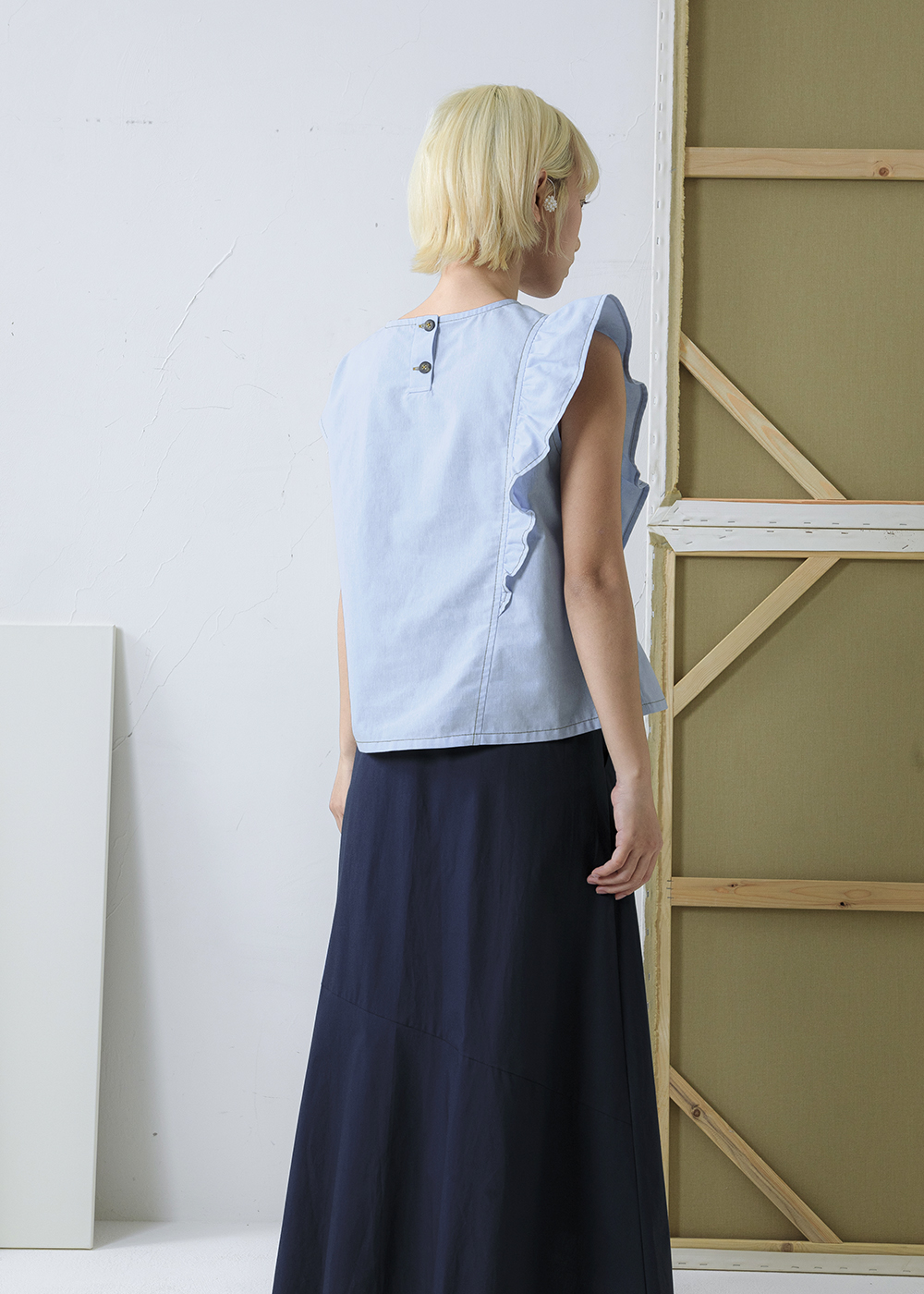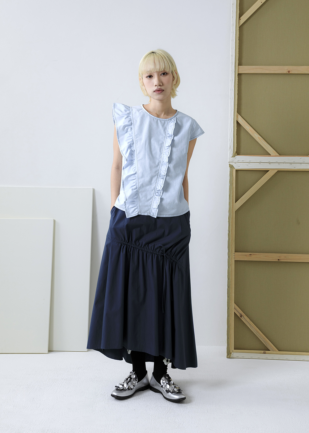 薄織丹寧肌理 |漣漪不對稱荷葉邊上衣