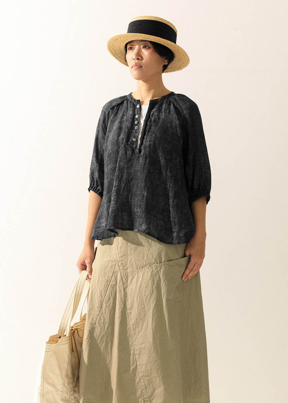 |苧麻微涼|亨利領珠節織帶寬版上衣